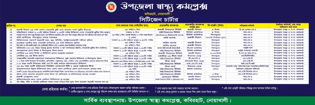 কবিরহাট উপজেলা স্বাস্থ্য কমপ্লেক্সে আগত রোগীদের স্বাস্থ্য সেবা নিশ্চিত করা এবং সুস্থ্য জাতি গঠনে কবিরহাট হাসপাতালের সকল কর্মকর্তা-কর্মচারীরা সদা সর্বদা এবং তৎপর থাকায় প্রতিজ্ঞাবদ্ধ।